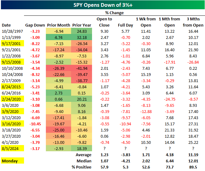 The stock market opened Monday, down more than 3%, which is rare. In fact, Bespoke Research pointed out that it was only the 20th instance in which the stock market (S&P 500) opened the trading session down more than 3%. Nobody knows what happens from here in the short run but historically markets rebound quickly. According to Bespoke, one month later, the market is up on average 4.18% and positive 73.7% of the time. And 3 months later the market is up 11.19%, with positive returns 89.5% of the time (see below). These are not predictions, but the odds are tilted in our favor.