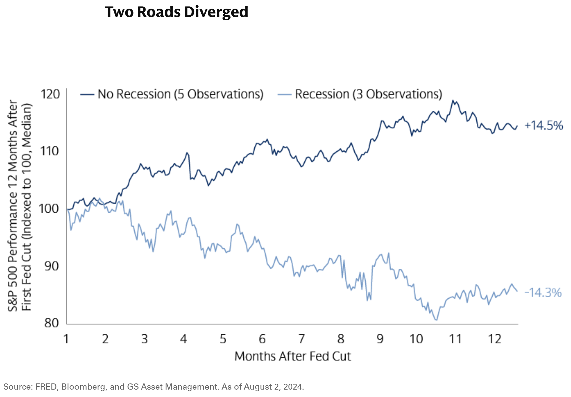 The Federal Reserve has driven inflation down from a peak of 9.1% in June of ’22 to 3% today. Weaker jobs data and a slowing economy will lead them to reduce interest rates, likely next month. Goldman Sachs published a piece Market Monitor (8/2/2024) showing how markets perform once the Fed begins reducing interest rates. If we are not in a recession or heading into one (as I believe is the case now), the market climbs 14.5% in the year following the Federal Reserve’s first rate cut. If we’re in recession, or on our way into one, the market falls on average, 14.3%. Again, this is not a forecast, I’m simply providing historical context.